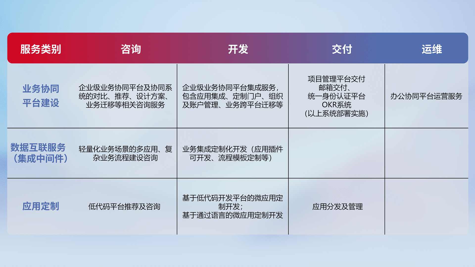 针对钉钉、、企微、、、IDaas等平台级产品提供产品的规划、、、、方案、、交付、、、定制化开发等服务,,实现如统一协同办公、、智能客户服务、、、混合会议管理、、、智能数据查询、、、、等业务场景,,,实现数字化转型。。。。